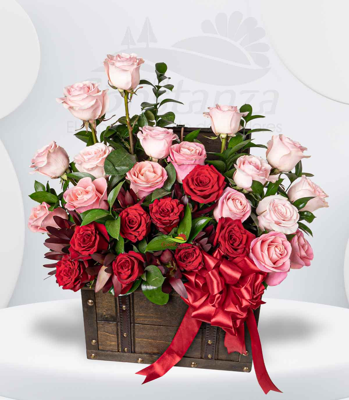 Este elegante baúl rosado con detalles en rojo es una verdadera expresión de amor y buen gusto.