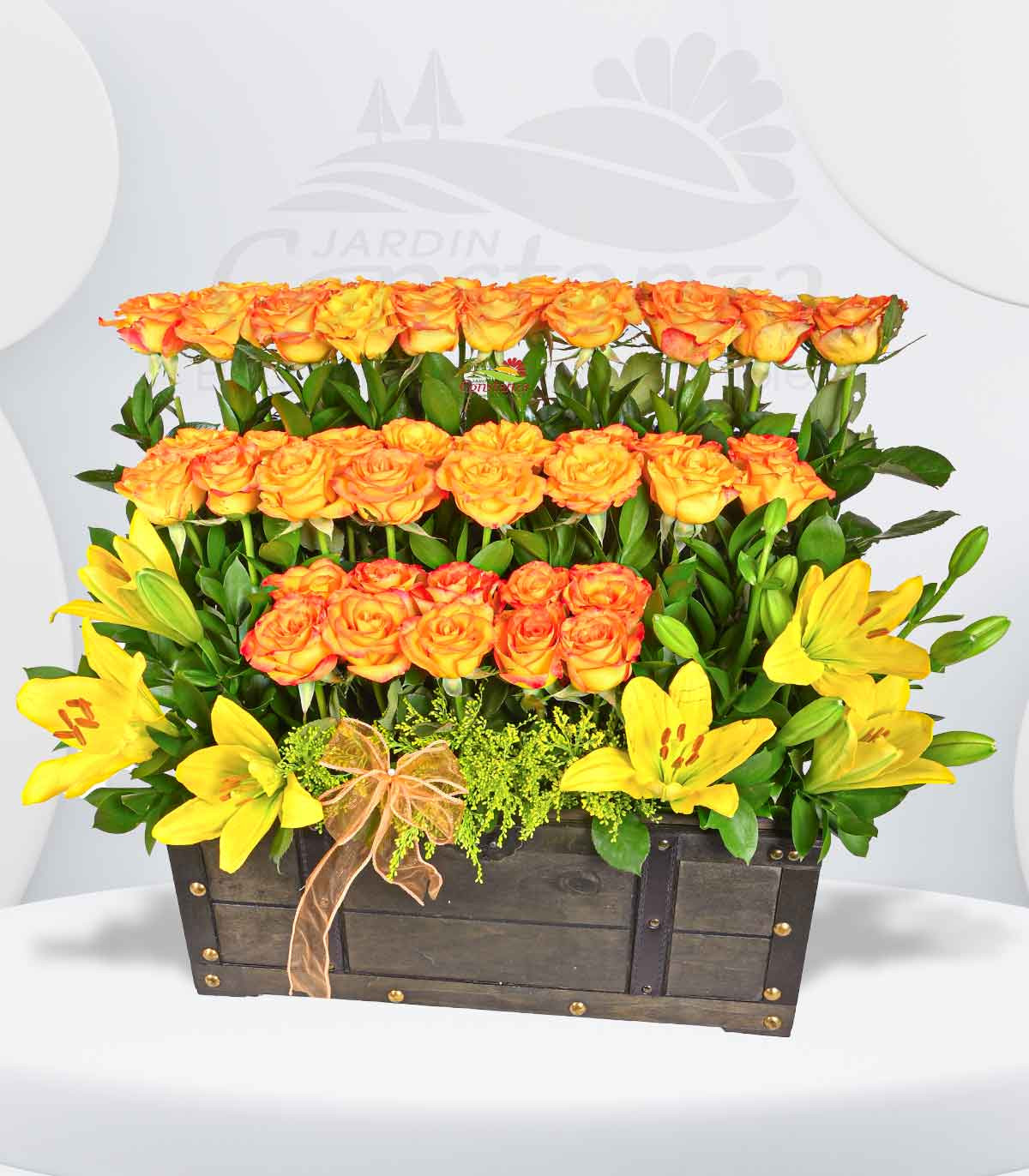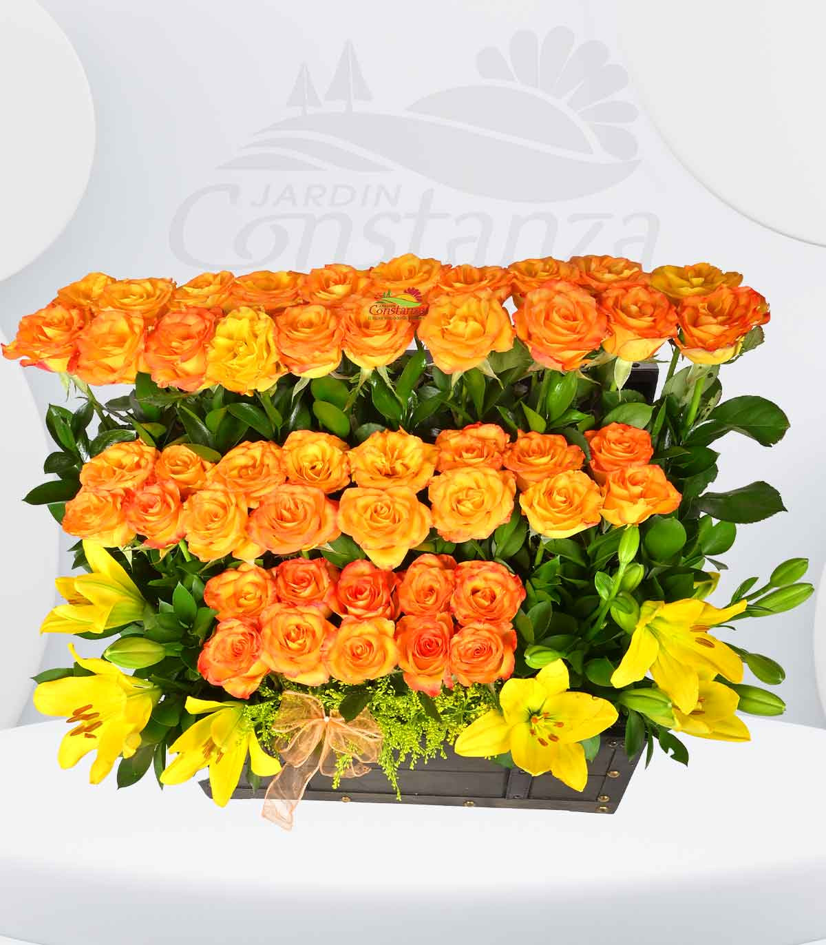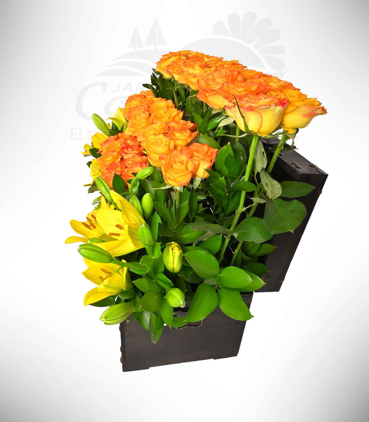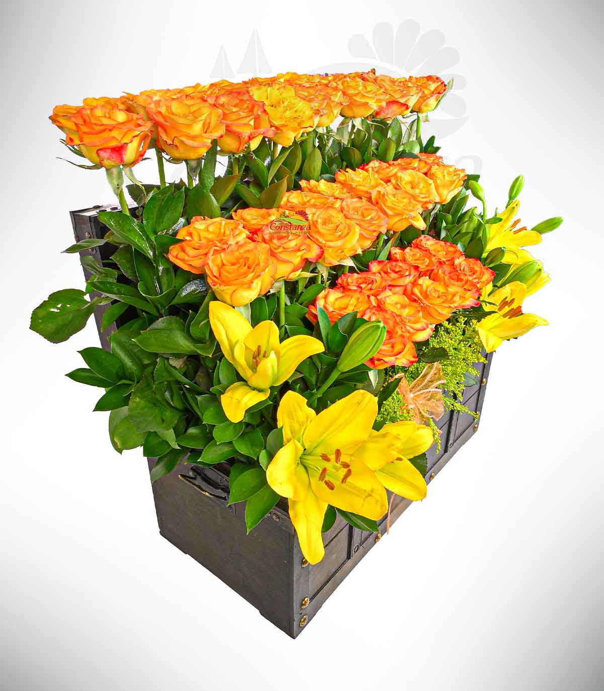 Con 46 rosas nacionales High magic y delicados lilium, este arreglo floral transmite elegancia y frescura. El baúl, además de ser un detalle único, es ideal para aquellos momentos especiales en los que se quiere expresar amor, gratitud o admiración. Su combinación de colores y flores crea una armonía perfecta que ilumina cualquier espacio. ¡Un regalo inolvidable que no dejará indiferente a nadie!