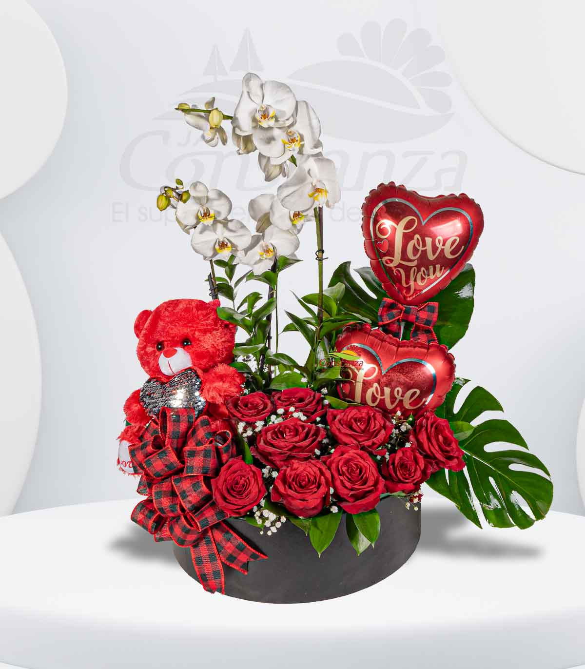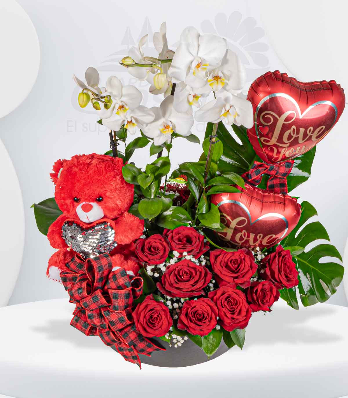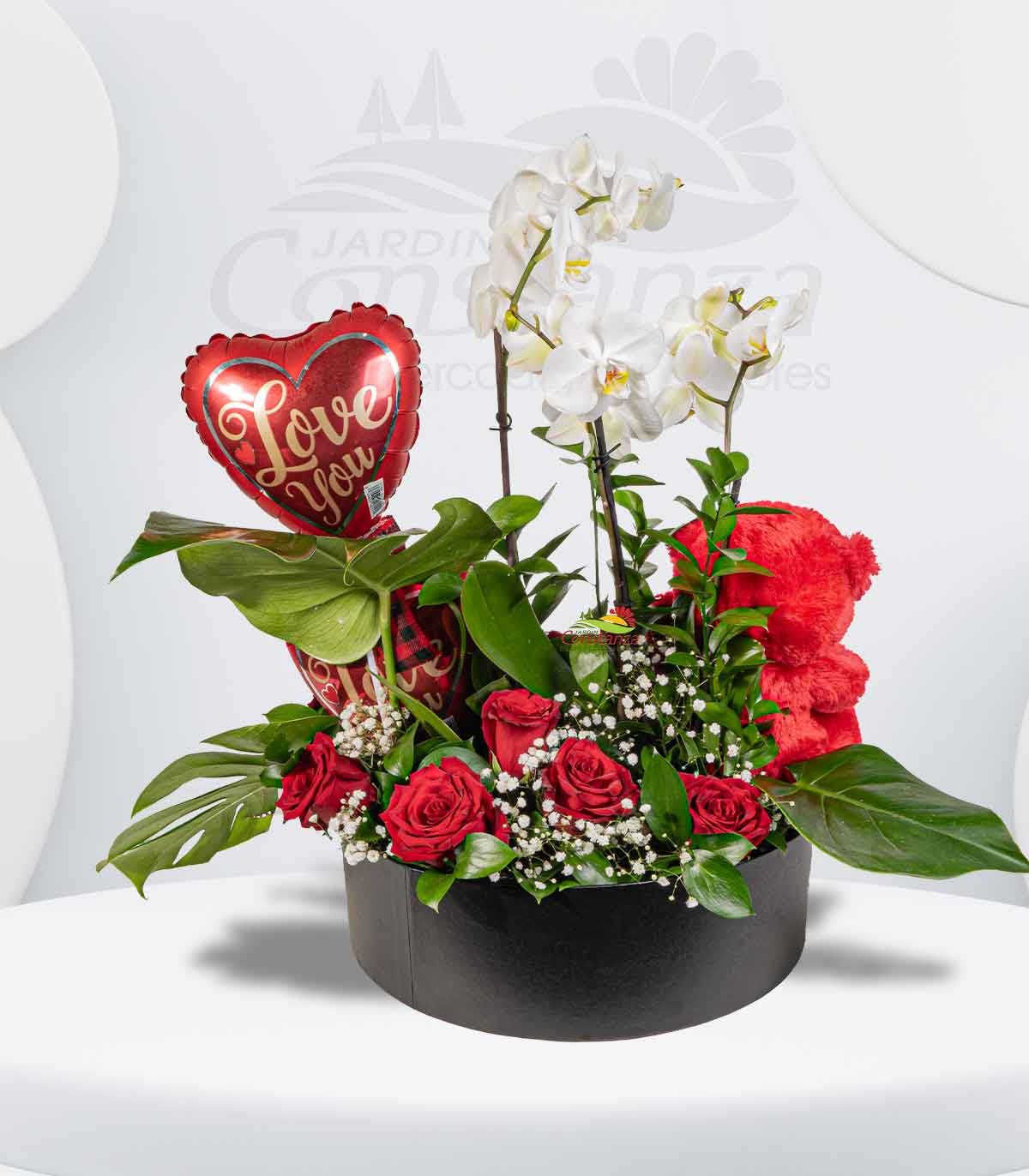 14 rosas importadas, 3 tallo de baby breath, 3 mini monstera, 2 orquidea de dos espigas, 1 peluche pequeño, 2 mini globo y complementos