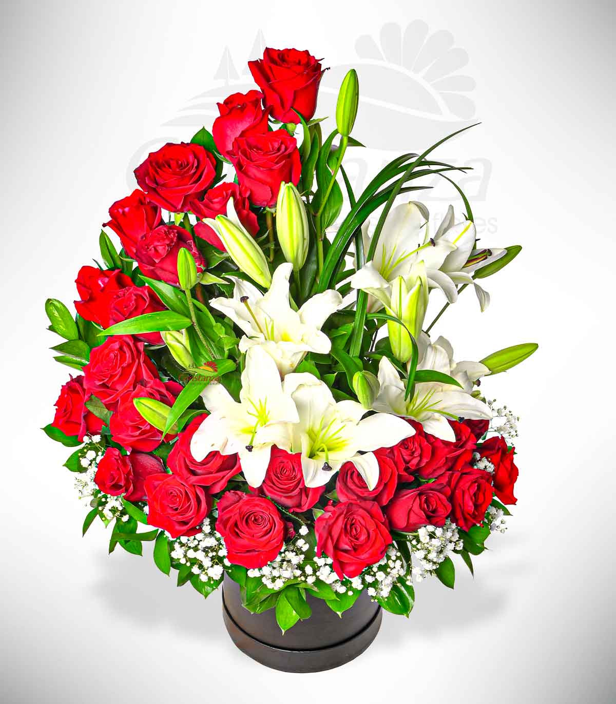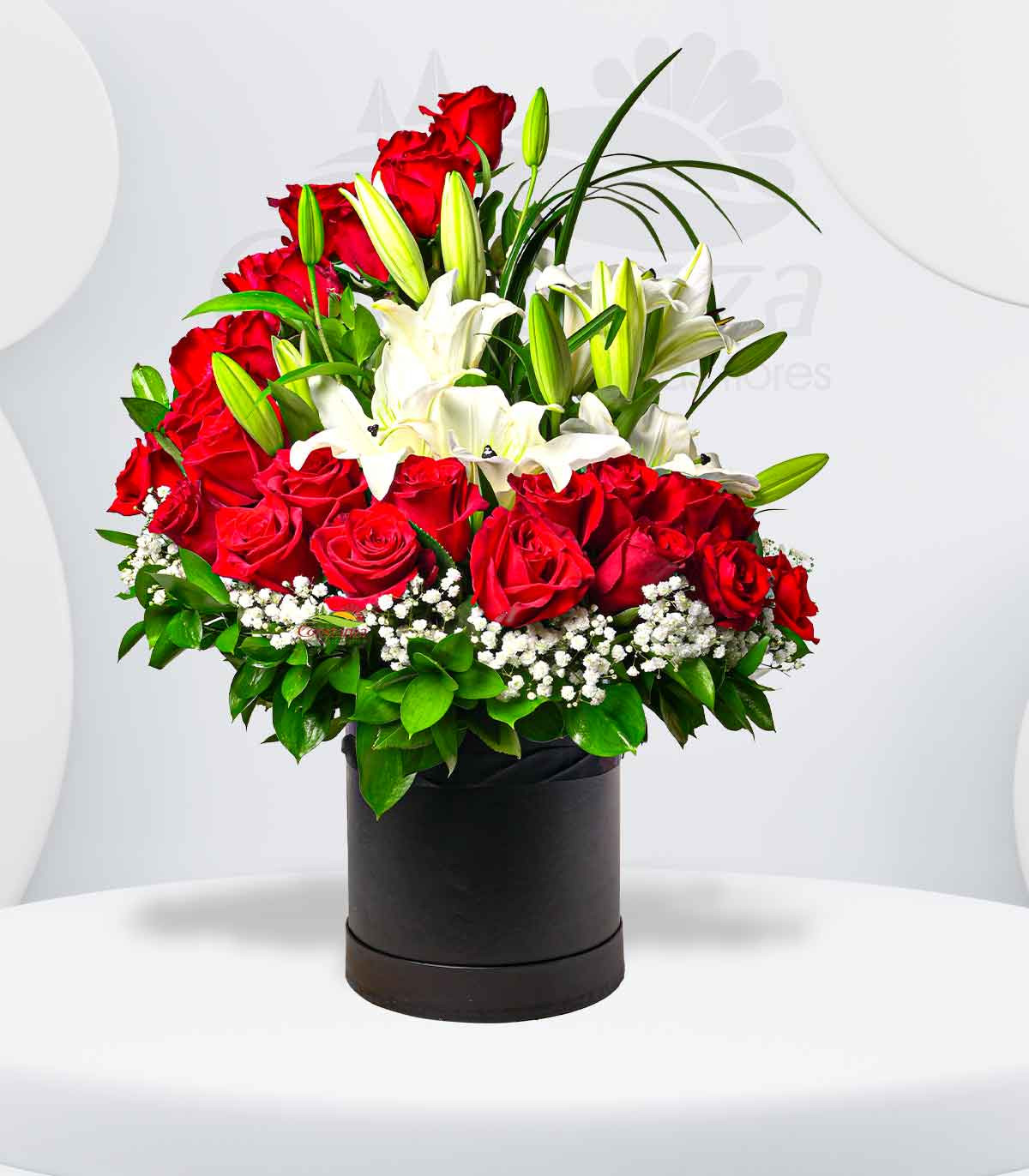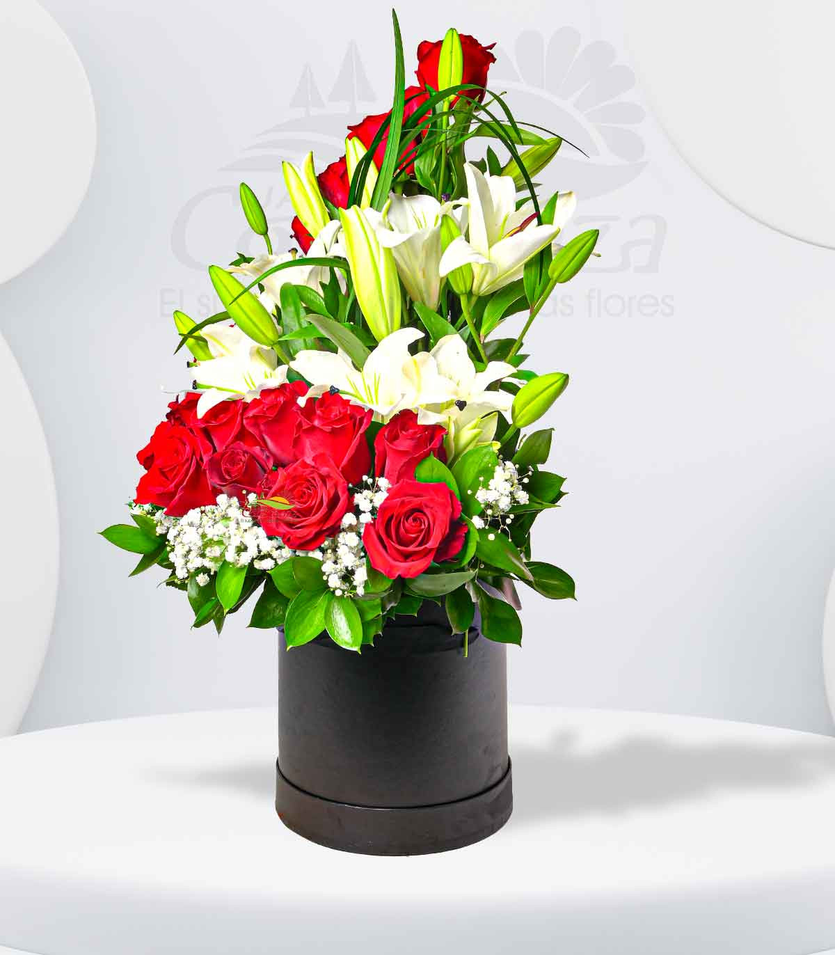 Es una elegante composición presentada en una caja floral que combina rosas rojas frescas y otros complementos, destacando por su sofisticación y belleza clásica. Este diseño, con su profundo color rojo, es ideal para expresar amor, pasión o gratitud, convirtiéndolo en un regalo perfecto para aniversarios, celebraciones románticas o para cualquier ocasión especial en la que se desee transmitir emociones intensas y sinceras. 🌹✨
