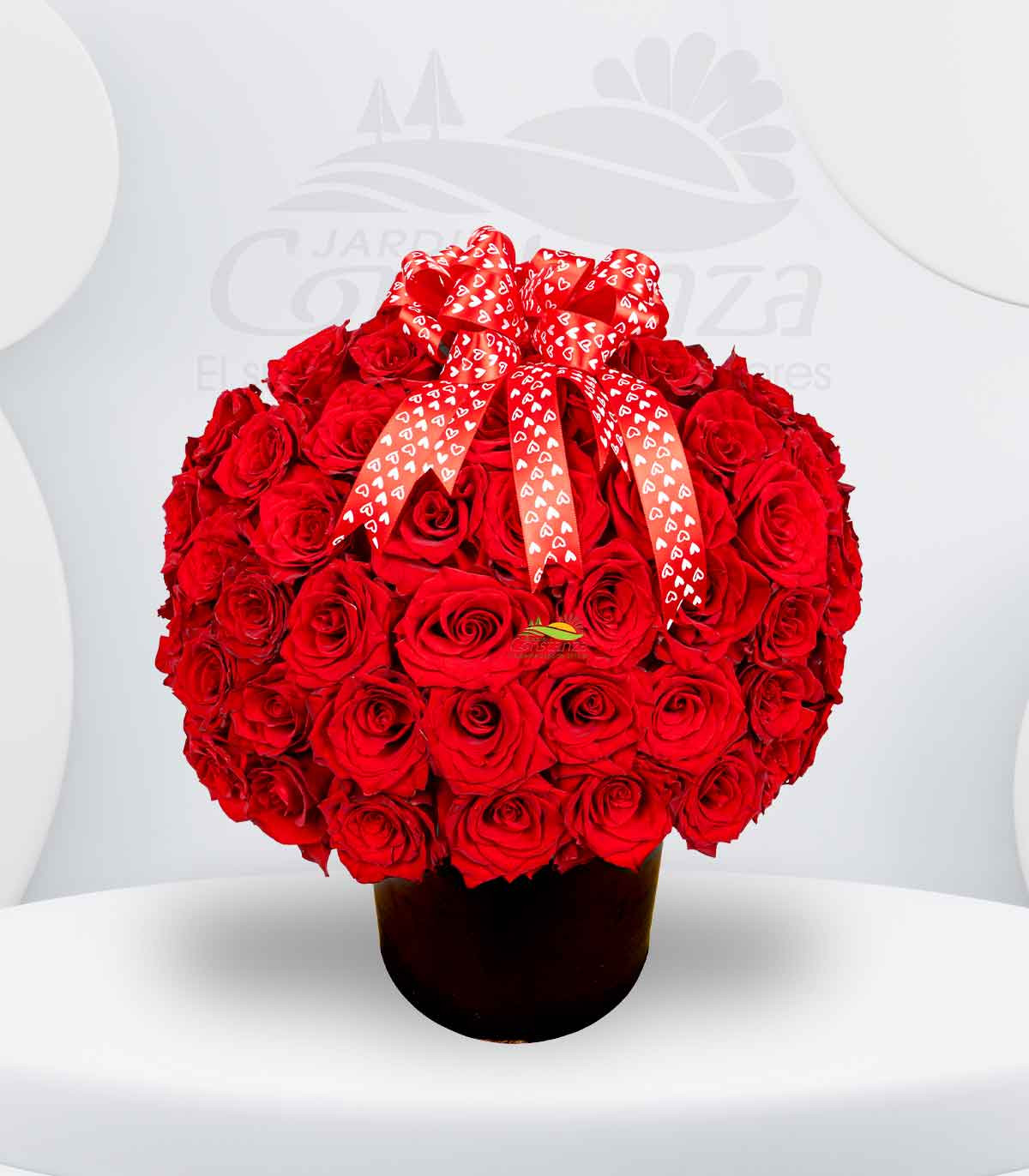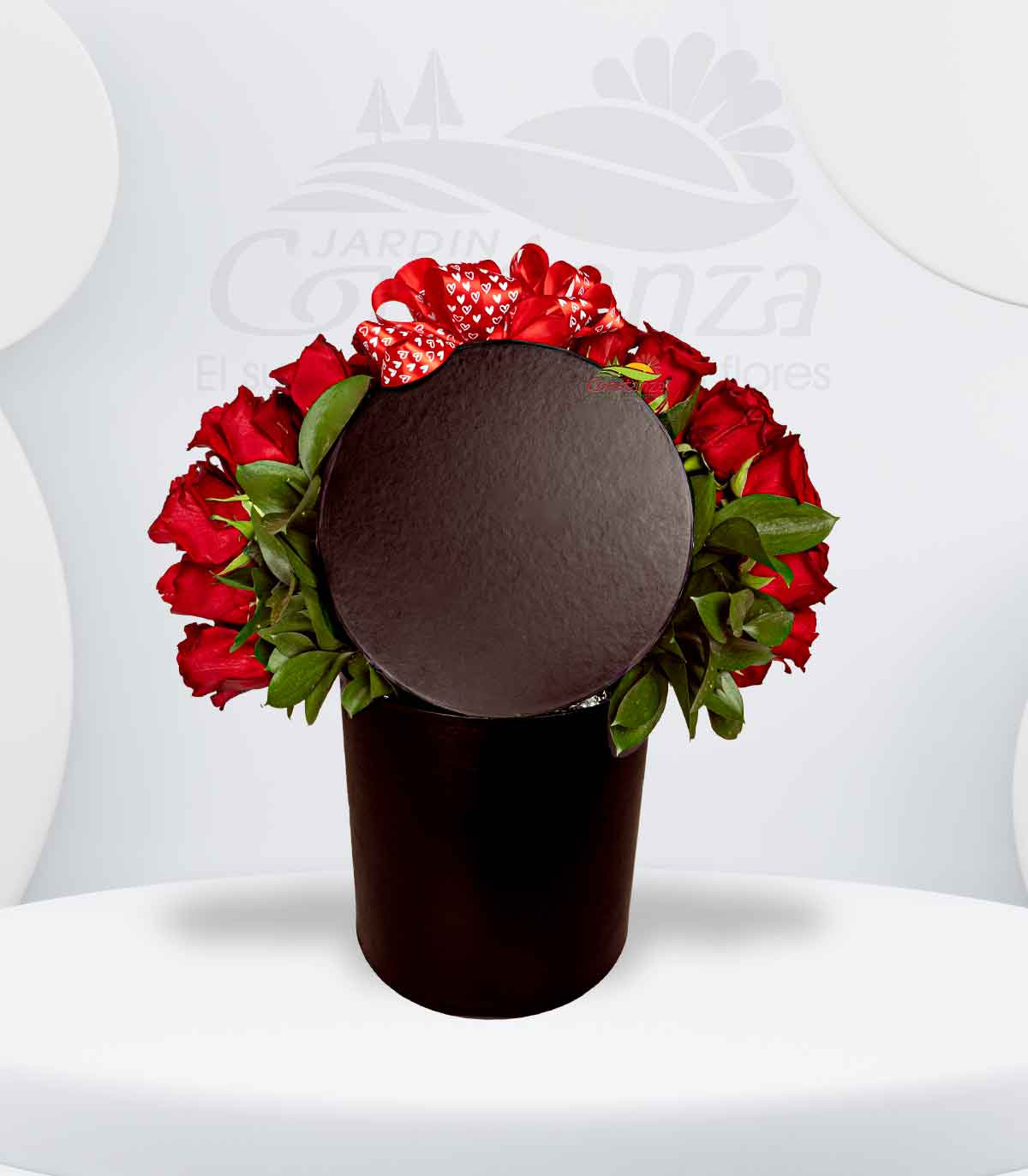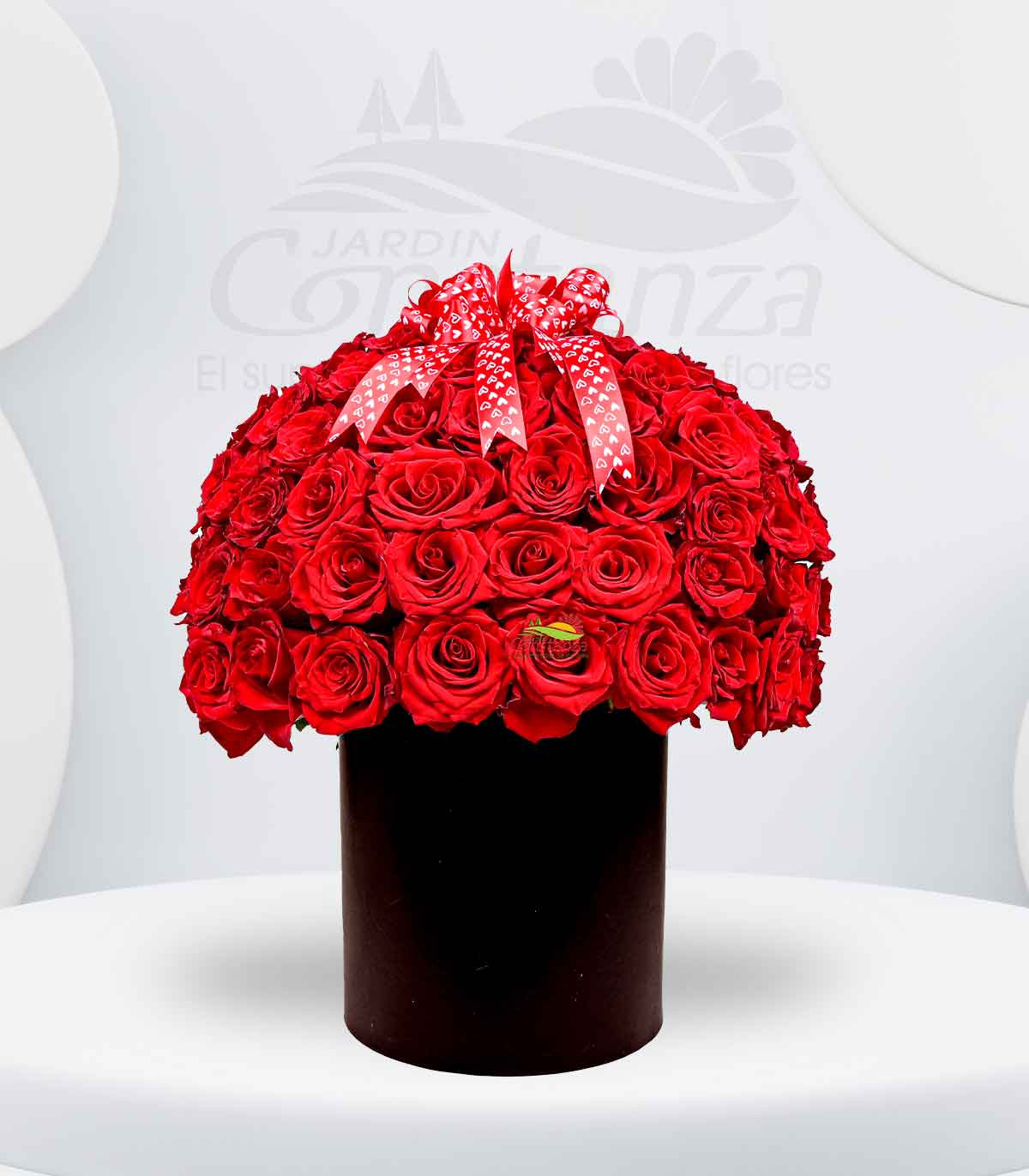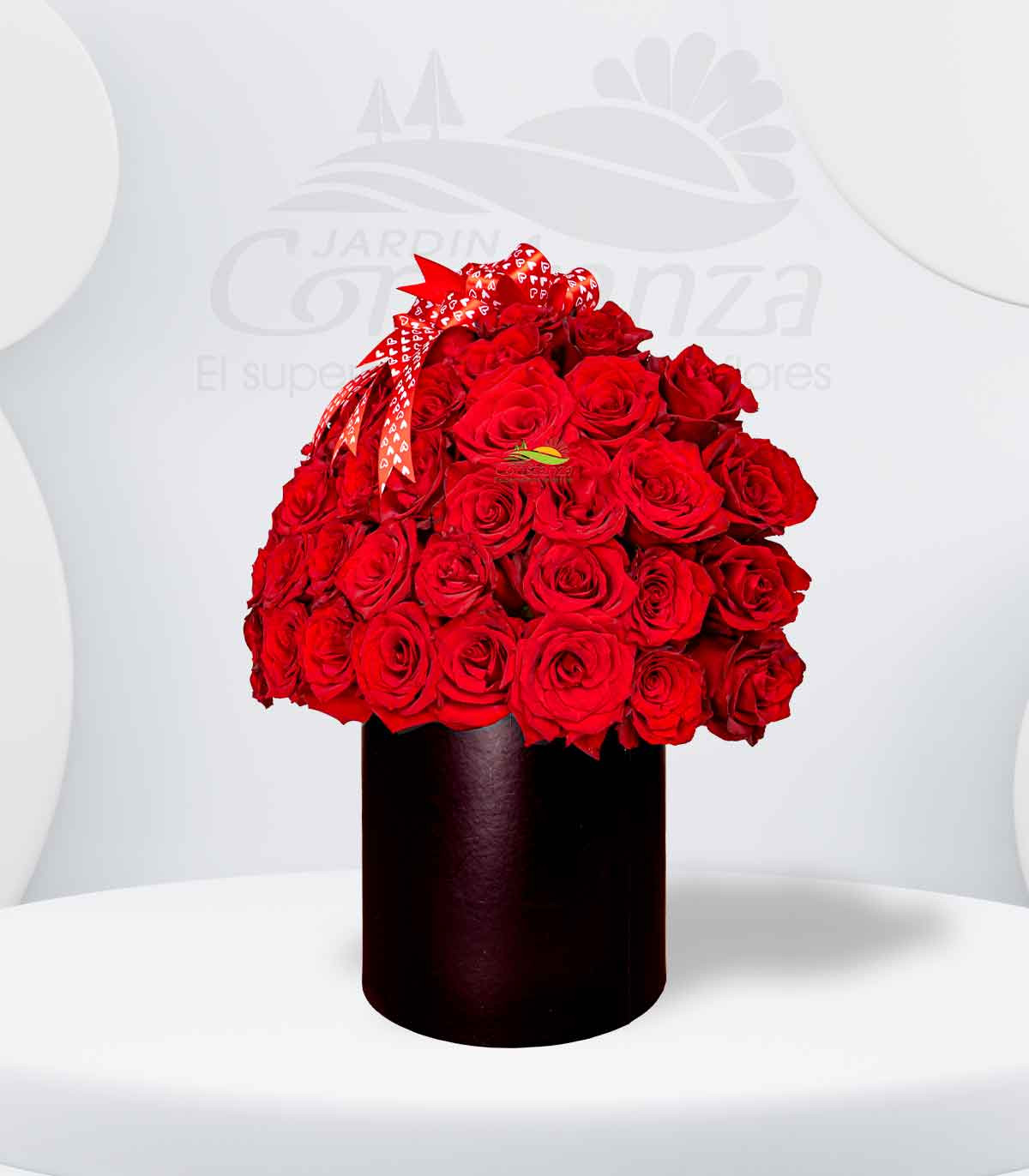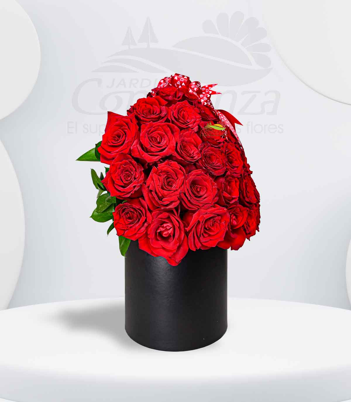 La combinación del rojo profundo de las rosas con la elegancia de la box negra crea un contraste sofisticado, poderoso y lleno de pasión.