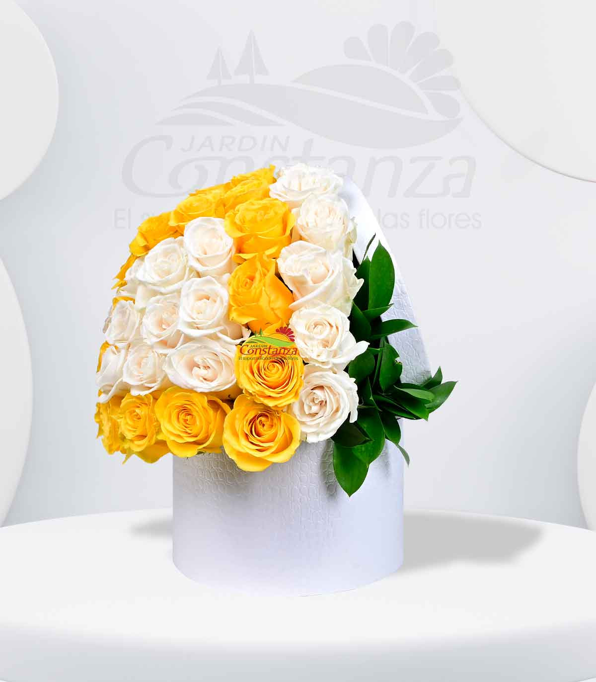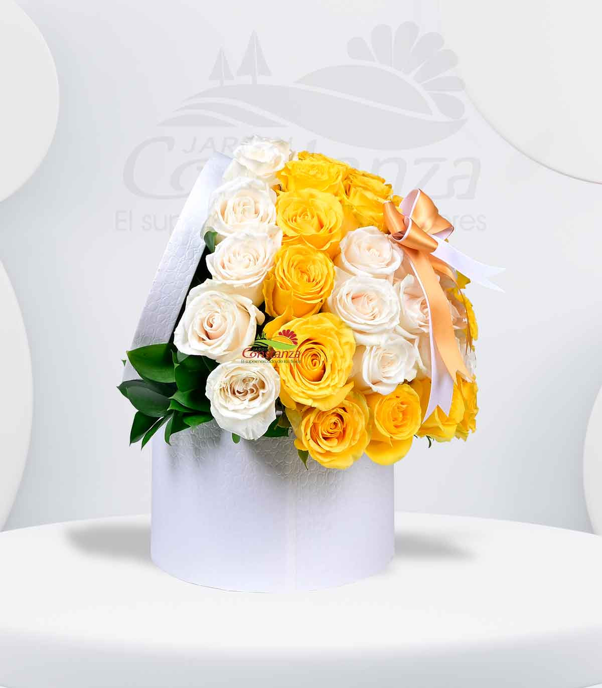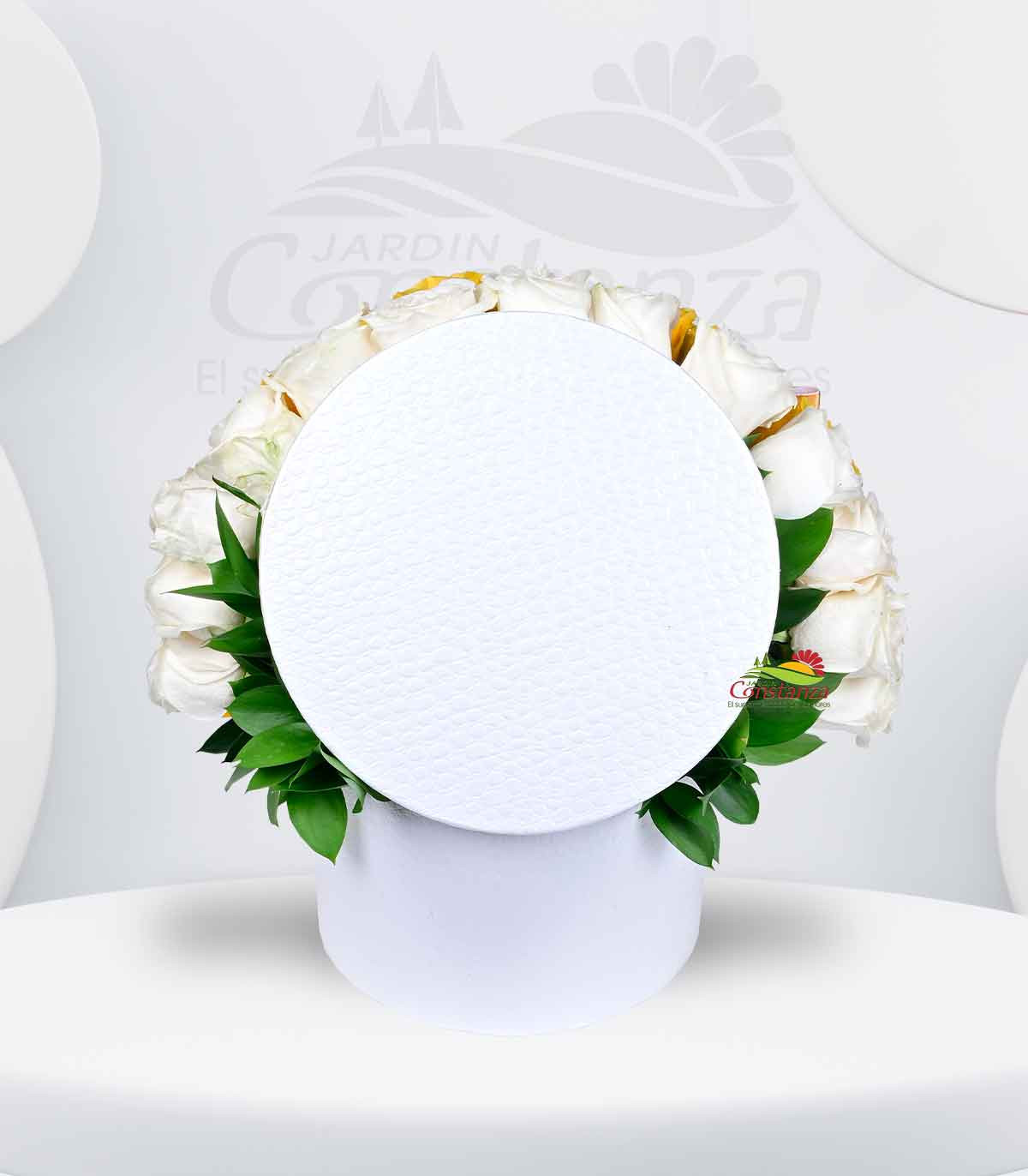 Un detalle que refleja pureza, alegría y luz. Este elegante box en tono blanco resalta la armonía entre la frescura de las rosas blancas y la vitalidad de las rosas amarillas, creando un arreglo lleno de energía positiva y delicadeza.