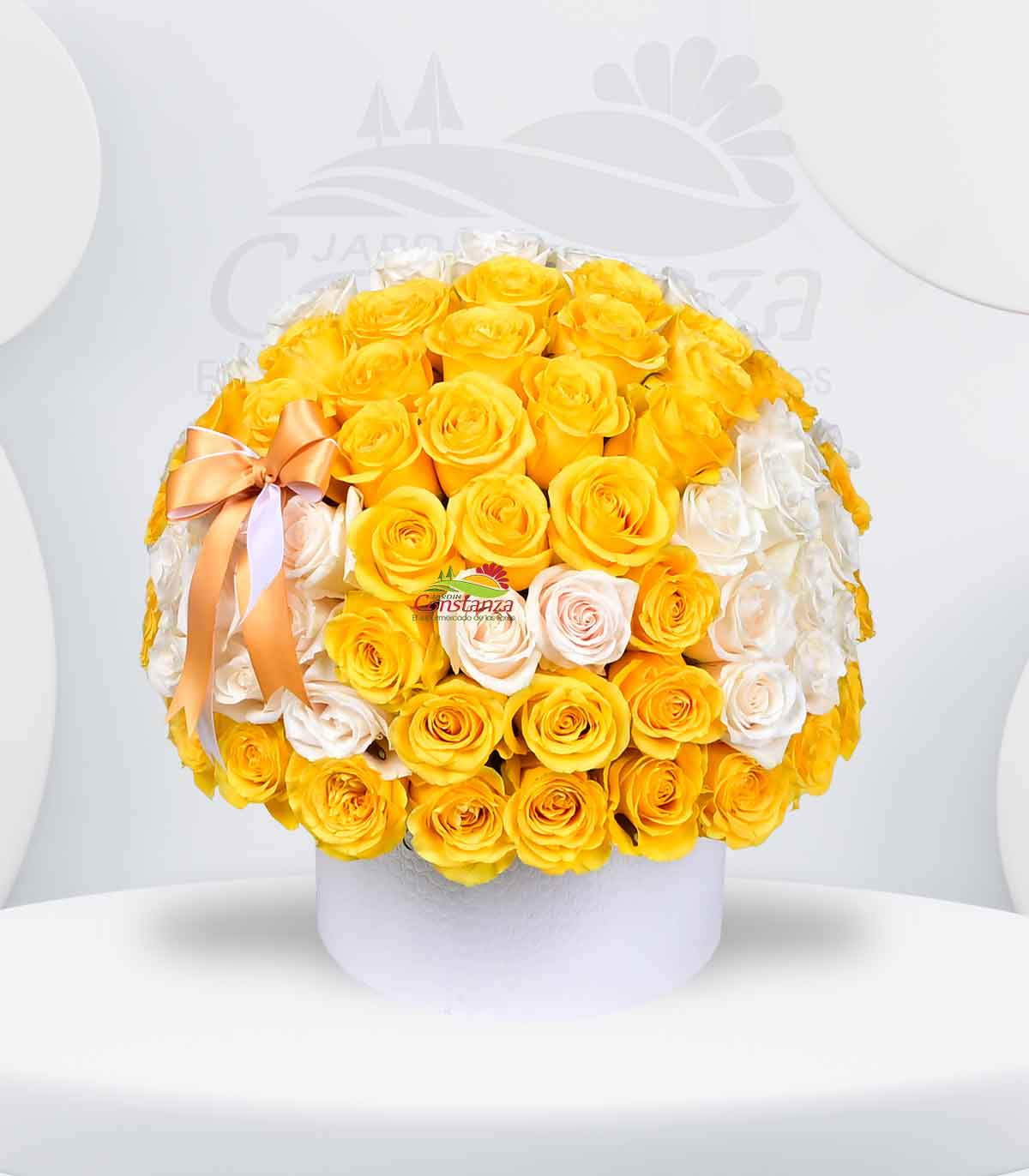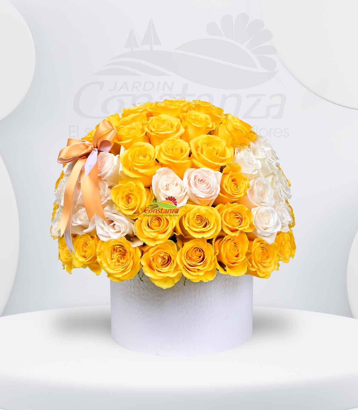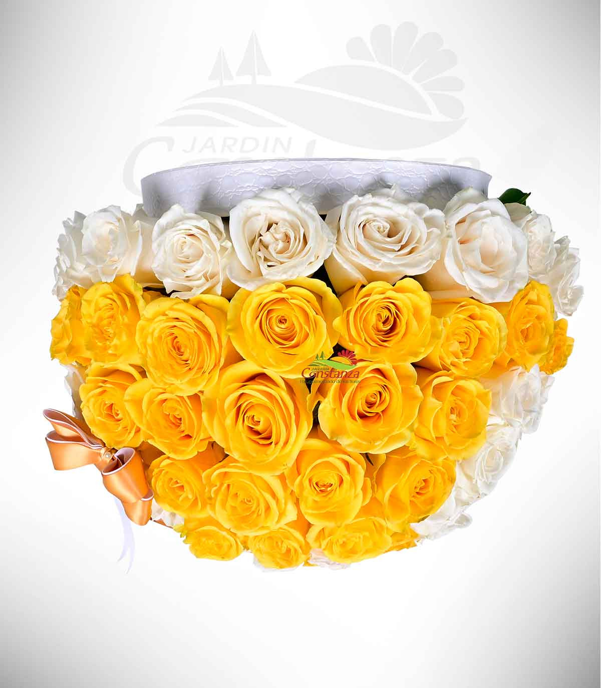 Un detalle que refleja pureza, alegría y luz. Este elegante box en tono blanco resalta la armonía entre la frescura de las rosas blancas y la vitalidad de las rosas amarillas, creando un arreglo lleno de energía positiva y delicadeza.