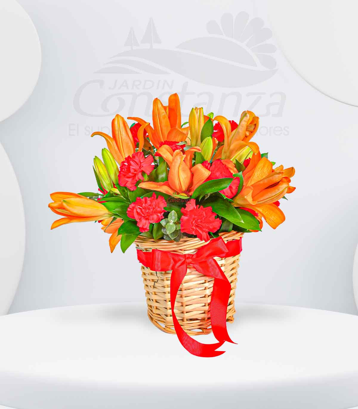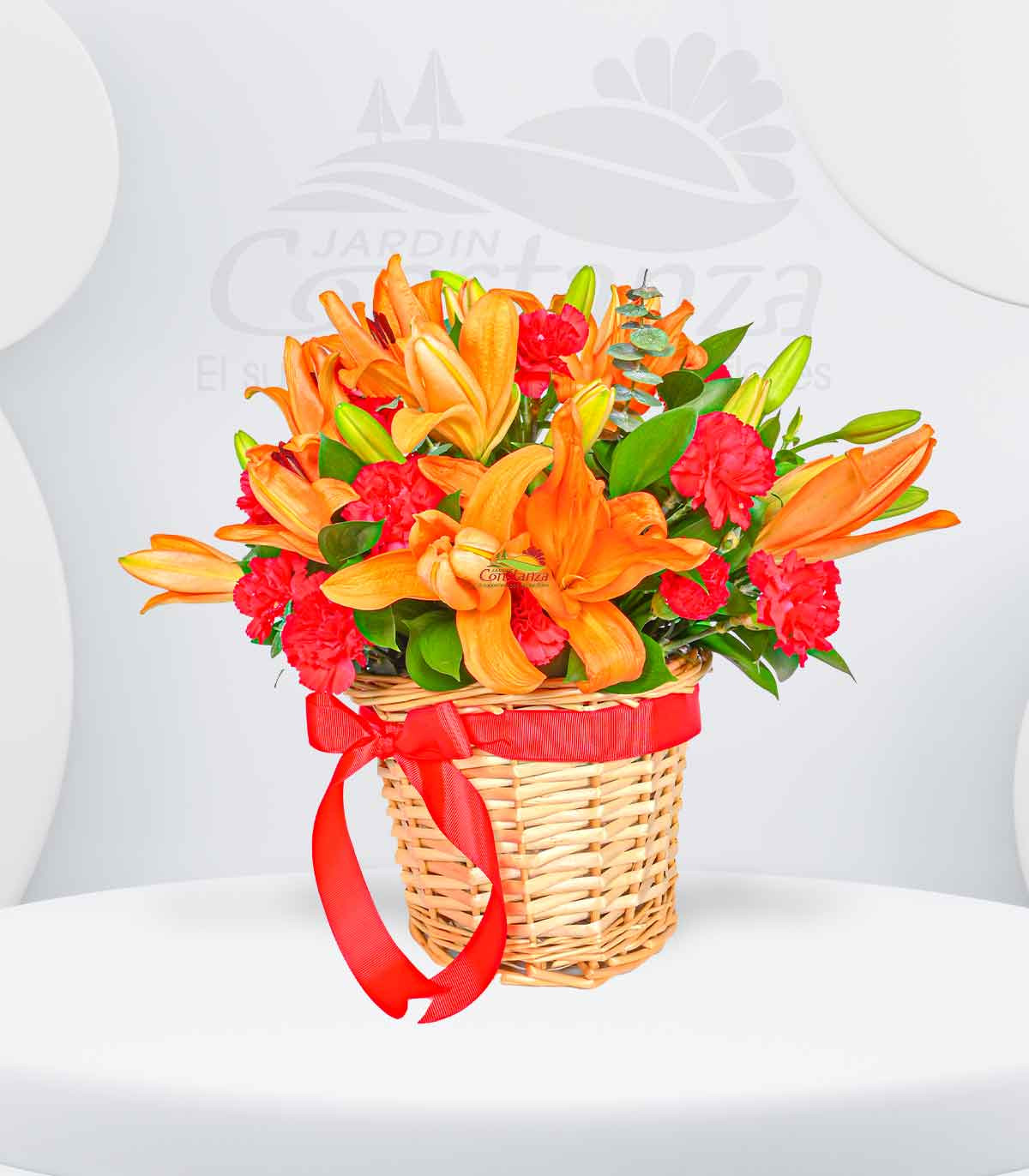 Un detalle lleno de energía y pasión: una canasta pequeña con lilium naranja y claveles rojos, perfecta para sorprender con color y alegría en cualquier ocasión.