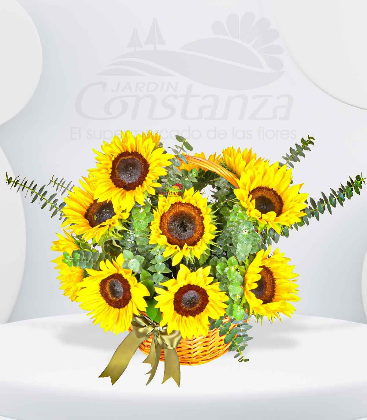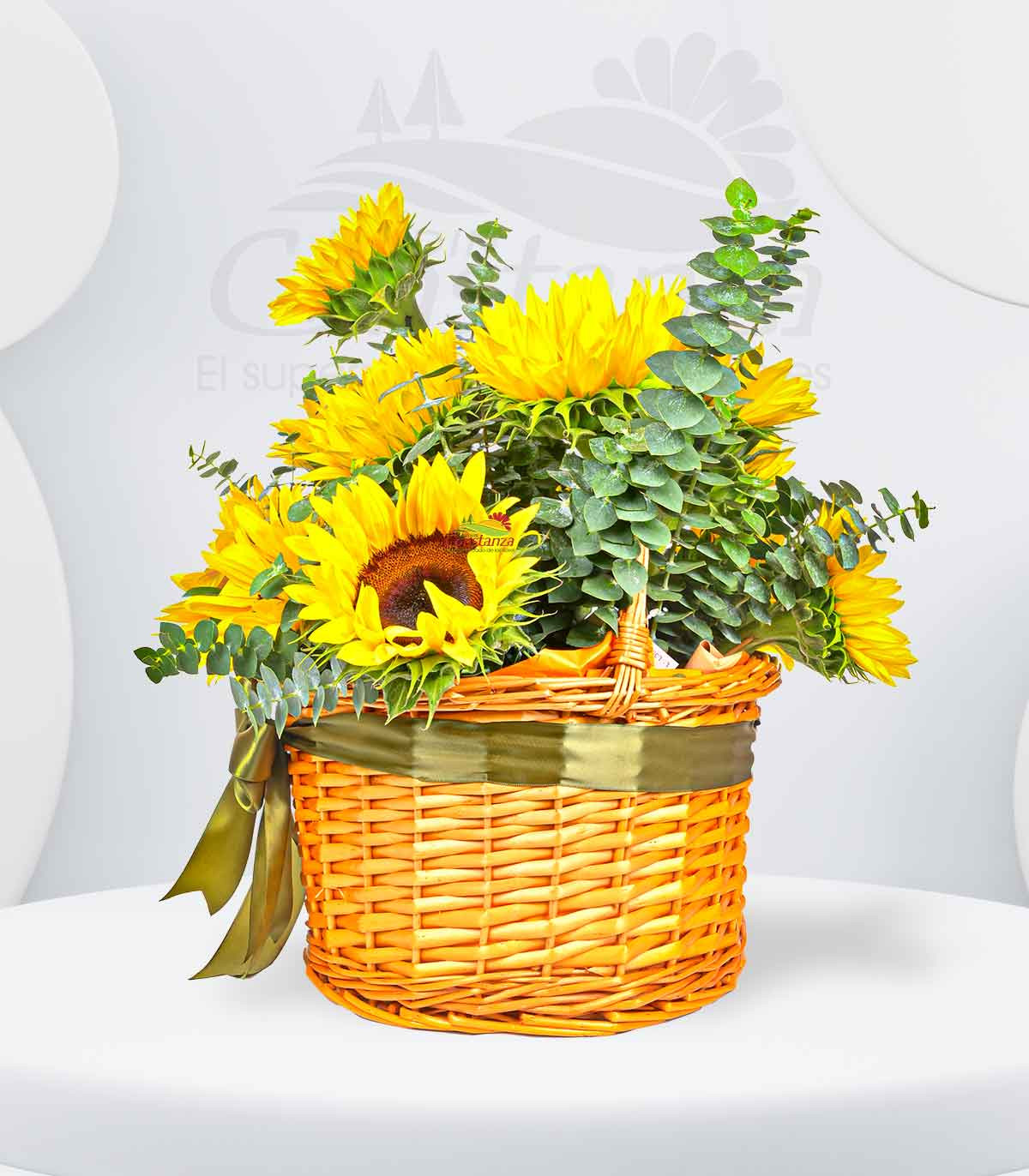 Un diseño alegre y vibrante compuesto por 14 girasoles acompañados de eucalipto fresco y delicados complementos, todos dispuestos en una encantadora canasta. Una creación llena de luz, energía positiva y frescura, ideal para regalar sonrisas y transmitir buenos deseos. 🌻💛