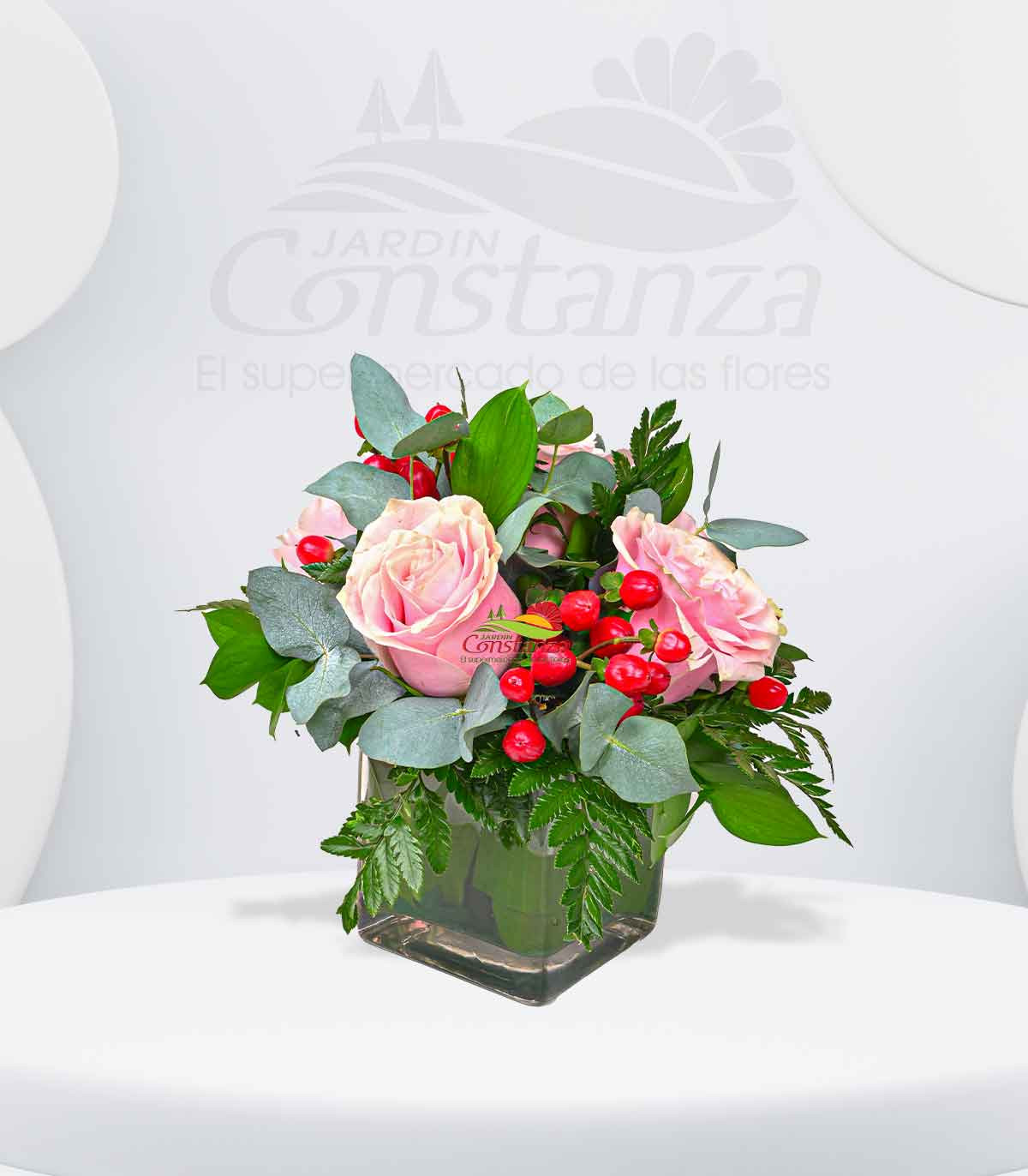 Un encantador puchero con 4 rosas importadas, hypericum y delicados complementos verdes, perfecto para decorar eventos, mesas o espacios especiales.