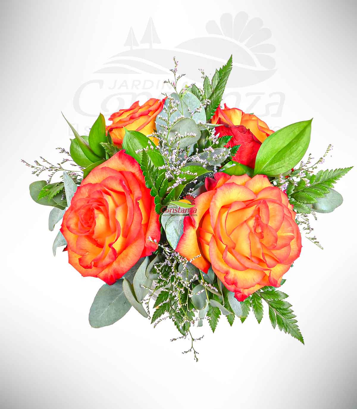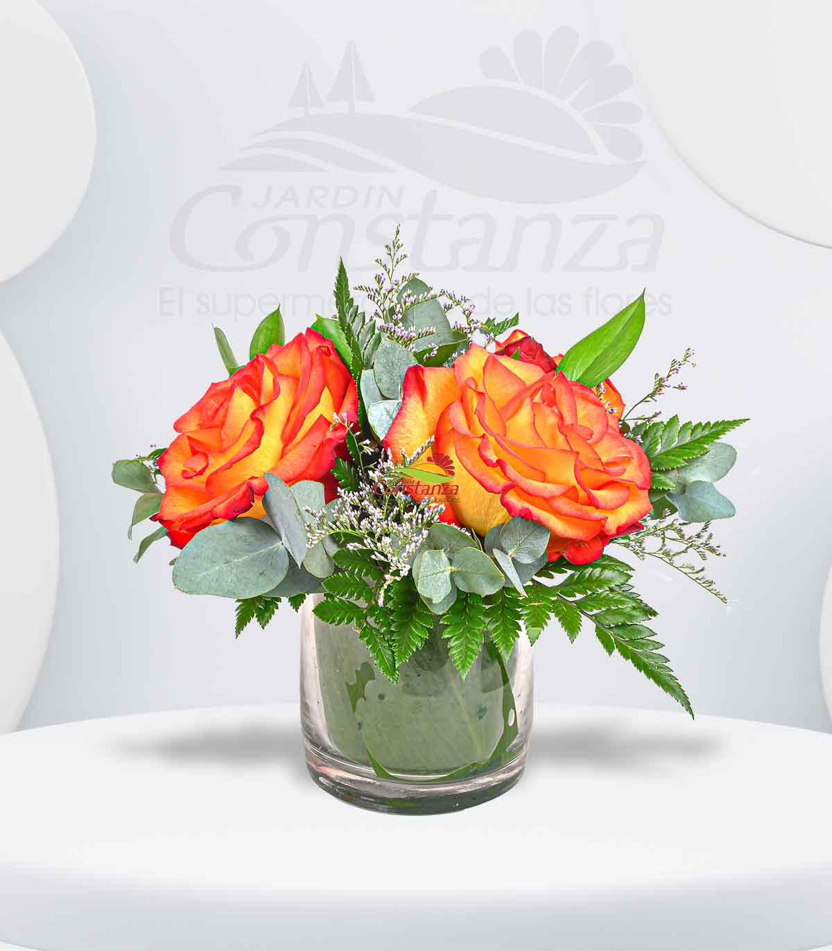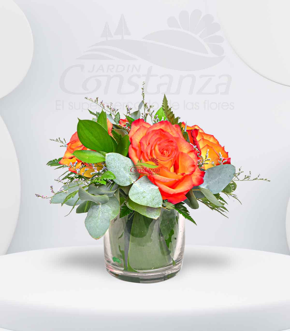 Este encantador arreglo en cristal redondo mediano combina 4 rosas nacionales en tono naranja vibrante con delicados complementos verdes, creando una pieza llena de energía, calidez y estilo.