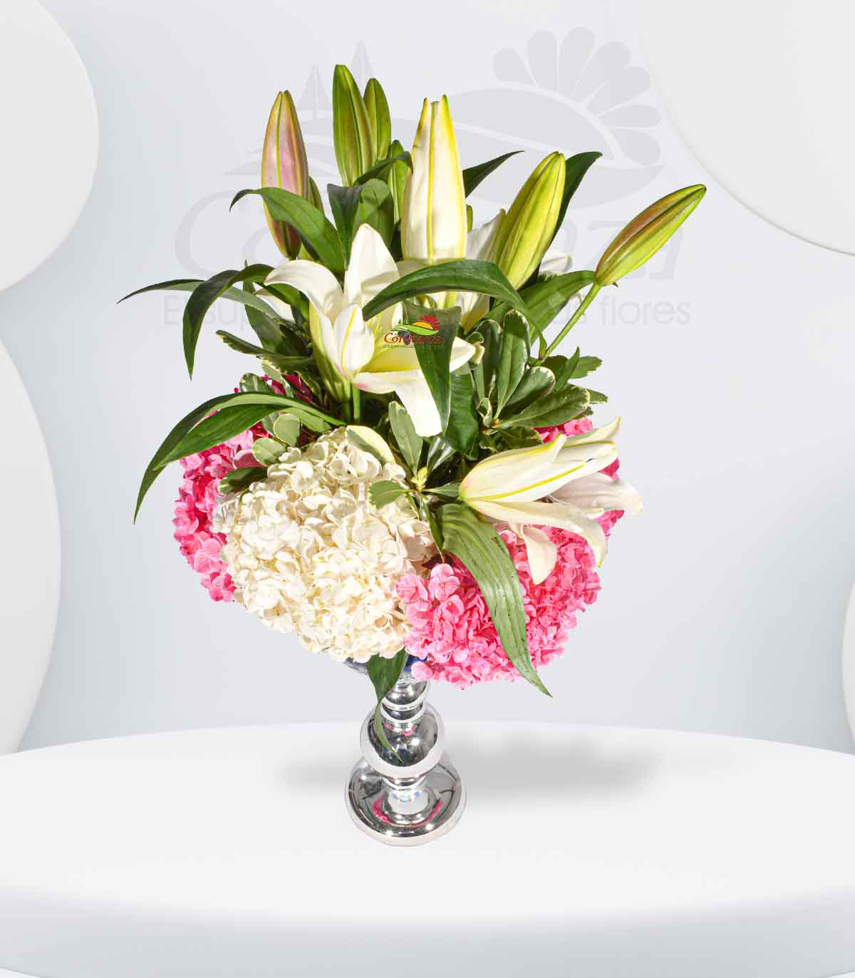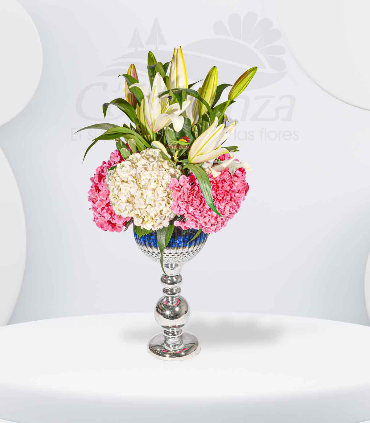 Un elegante diseño en cristal estilo copa, compuesto por la delicadeza de la hortensia blanca y rosada y la elegancia del lilium, acompañado de finos complementos verdes. Un arreglo que transmite pureza, dulzura y distinción, ideal para regalar en momentos especiales o para realzar la belleza de cualquier espacio. 🌸