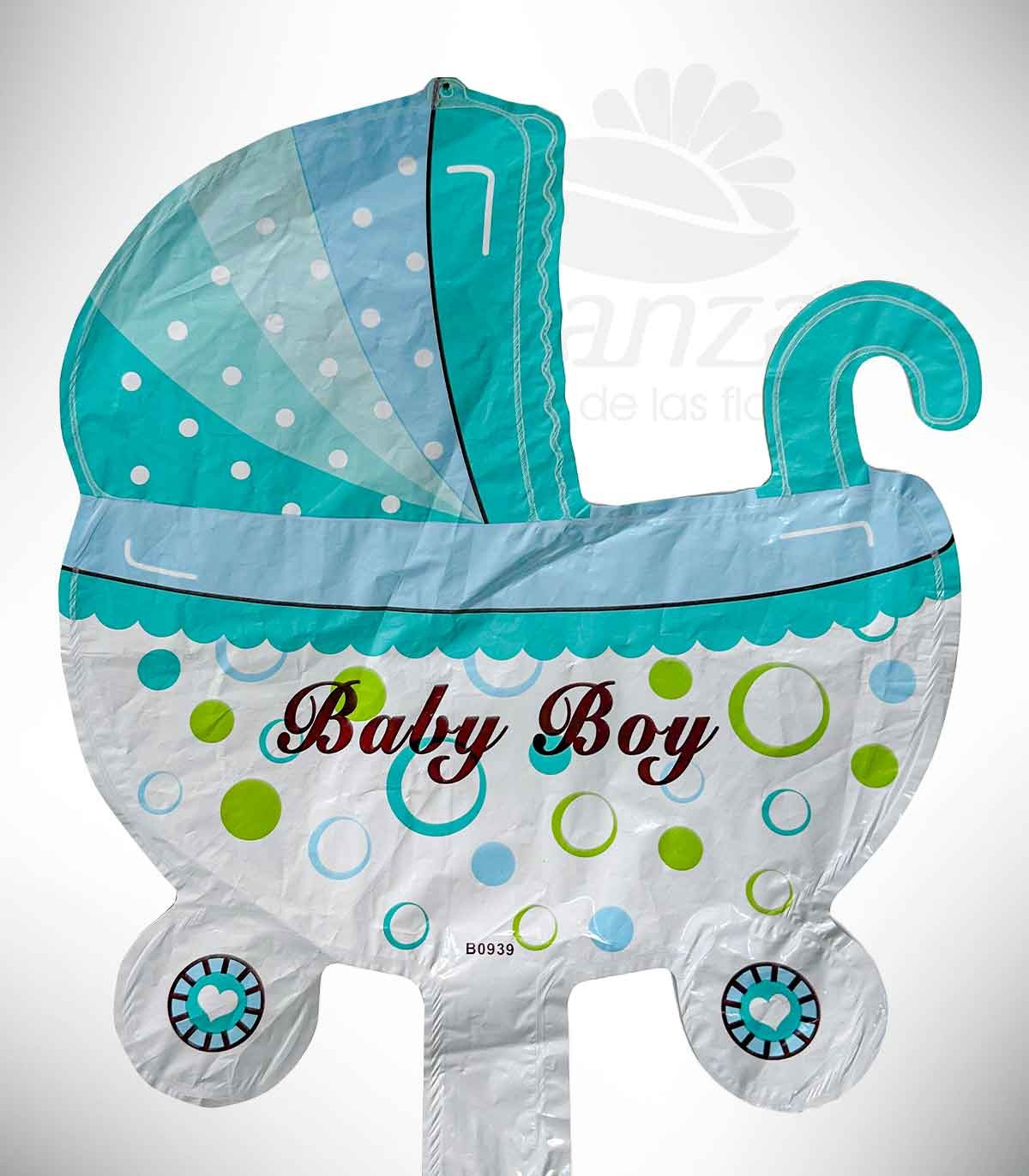 Este globo metálico con forma de cuna y la frase “Baby Boy” es el complemento ideal para arreglos florales, canastas o decoraciones de nacimiento. Su diseño adorable y lleno de ternura celebra la llegada de un hermoso niño, aportando un toque especial y festivo a cualquier regalo de bienvenida.