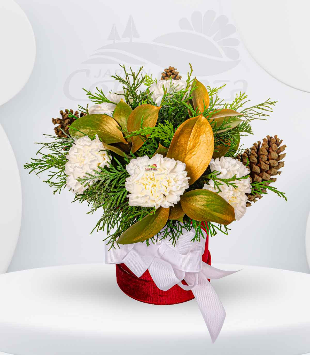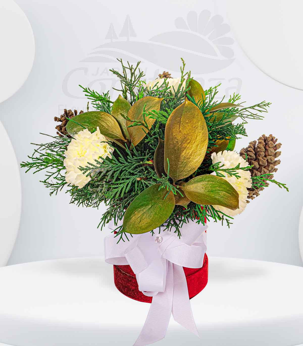 12 claveles importados, 1pino cipres, 5 conos de pino