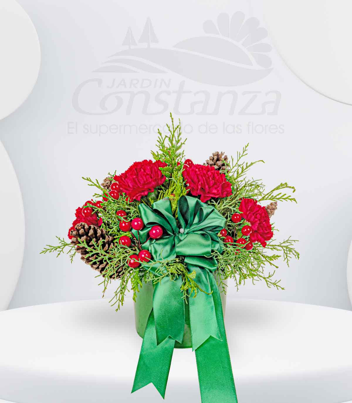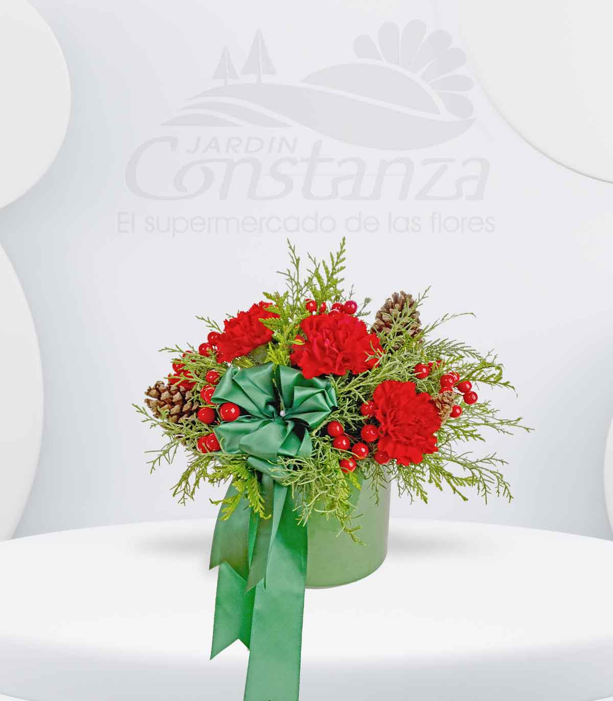Arreglo navideño elaborado con 5 claveles importados, pino ciprés, ramas de cherry, conos naturales y delicados complementos. Diseñado en una fina cerámica verde que resalta la frescura y el encanto de cada elemento. Ideal para decorar espacios con elegancia, modernidad y el espíritu auténtico de la Navidad.