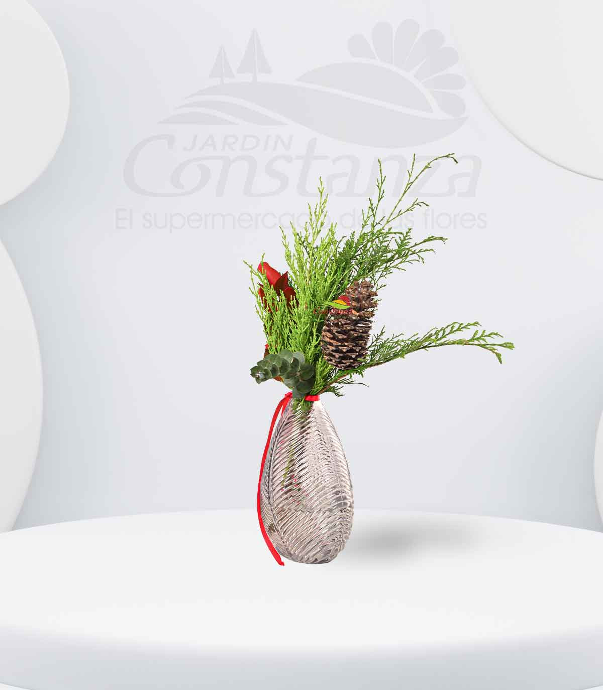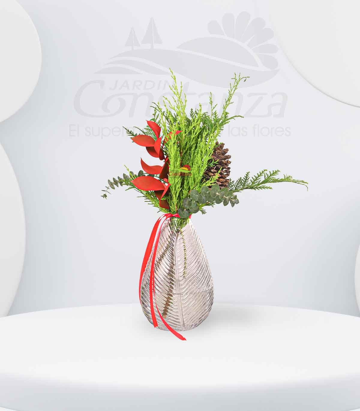Este arreglo en base de cristal resalta la belleza vertical y delicada de los pinos y rusco, conocidos por su aroma envolvente.Una pieza elegante, minimalista y perfecta para quienes aman los detalles que transmiten calma y armonía.