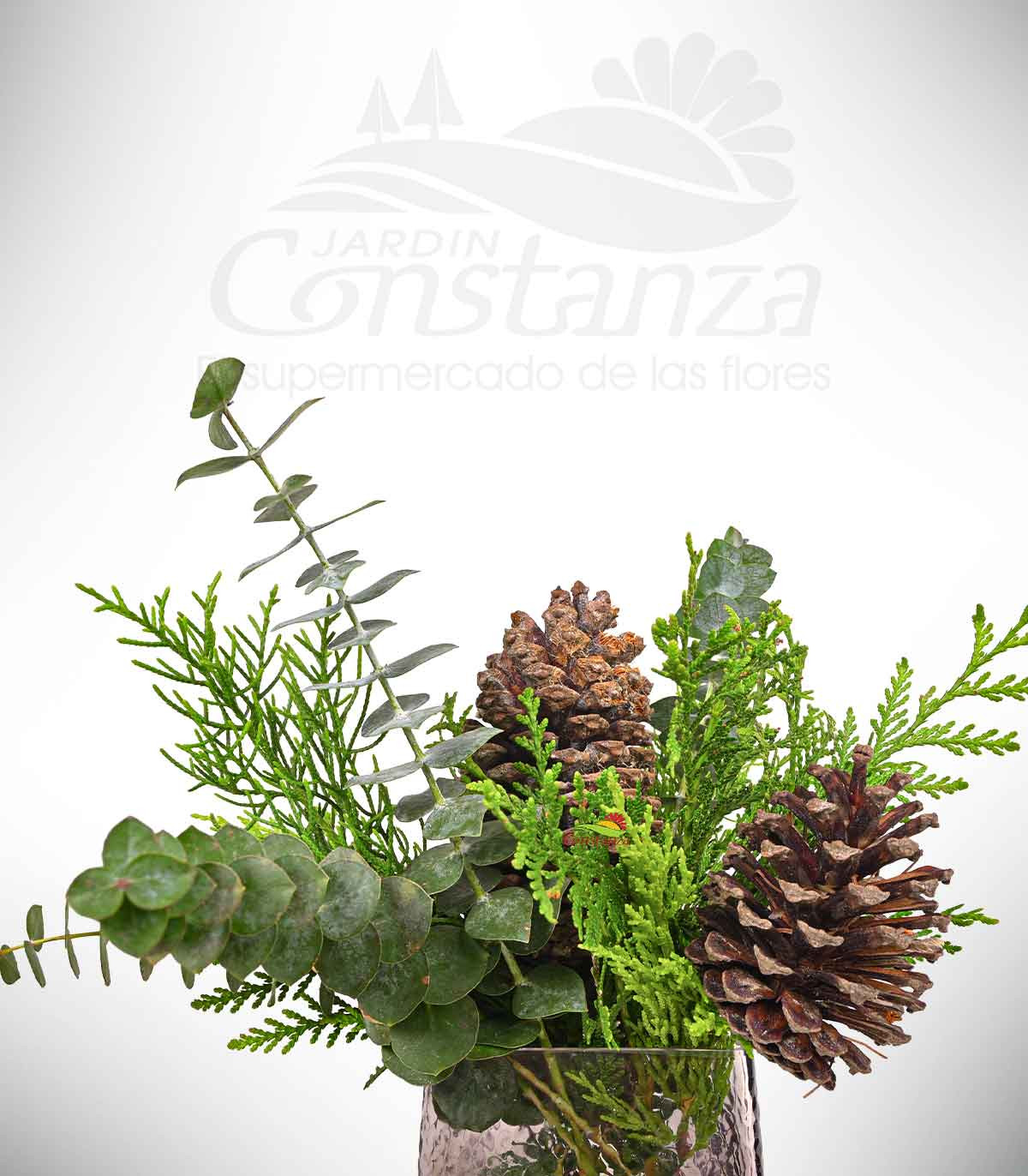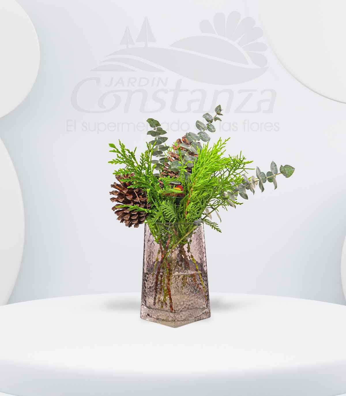Este diseño en base de cristal destaca la autenticidad de los pinos, conos, eucalipto y complementos, creando una composición natural llena de textura y carácter. Su mezcla de verdes y elementos orgánicos aporta un aire contemporáneo, fresco y elegante.