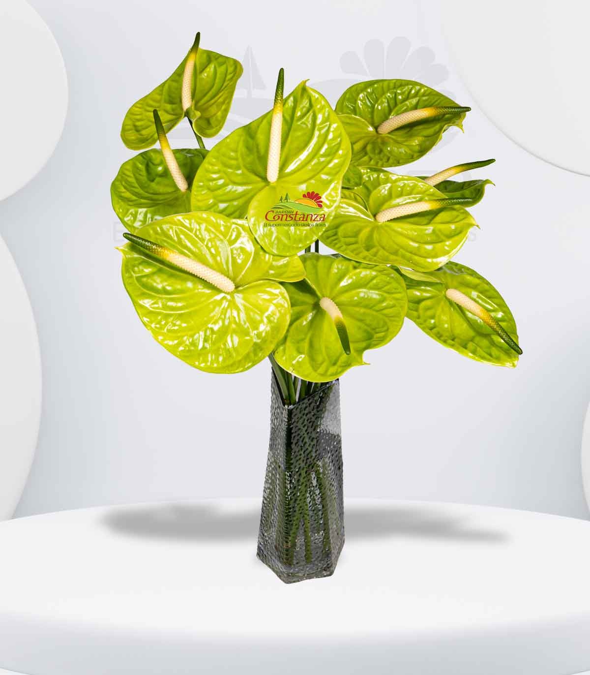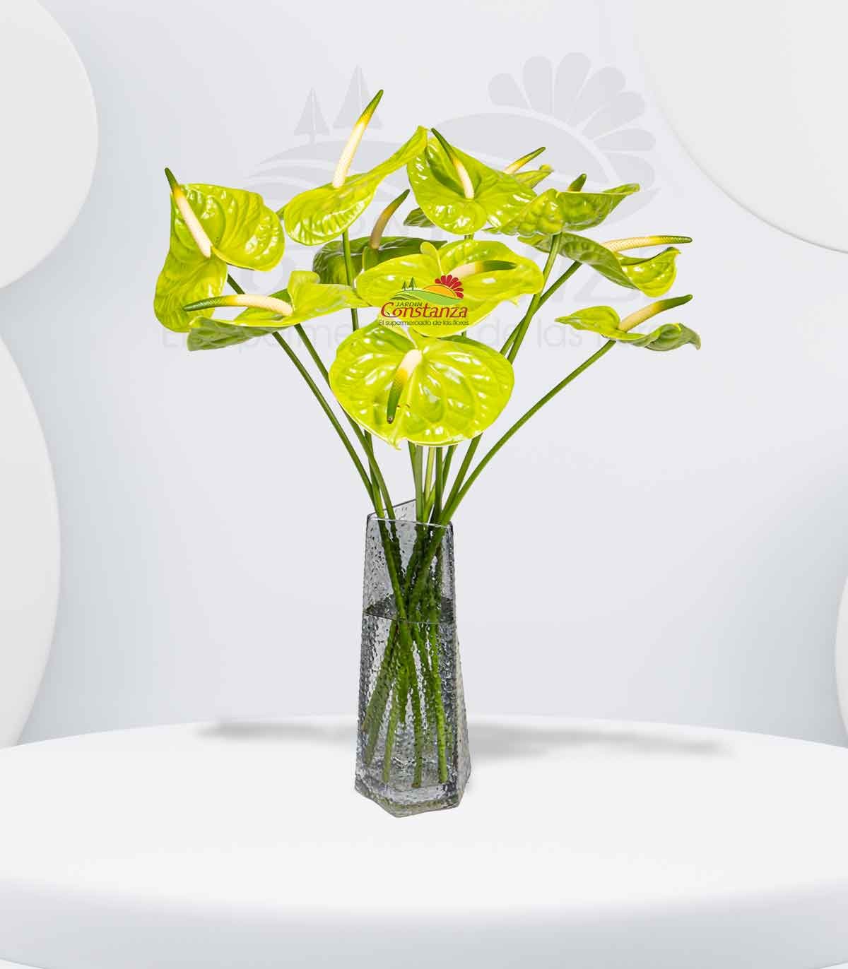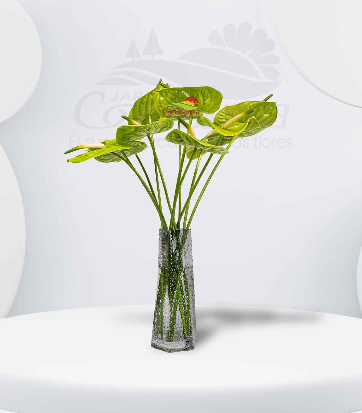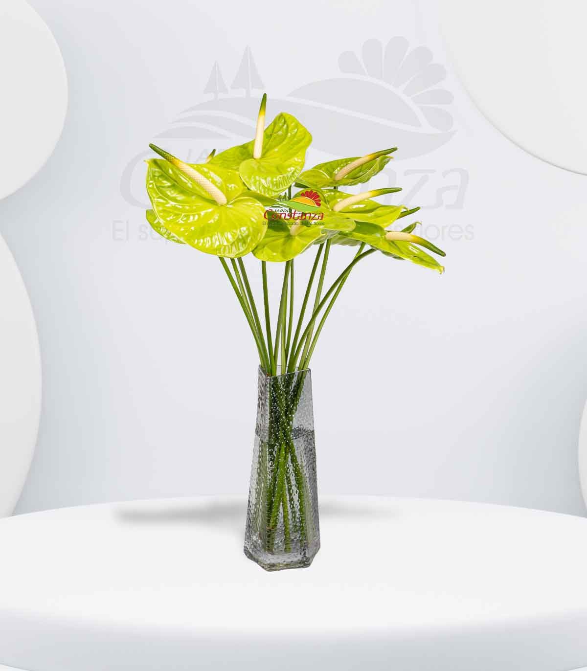 Este diseño en base de cristal resalta la belleza única de los anthurios, flores exóticas que simbolizan hospitalidad, amor y elegancia. Sus hojas brillantes y forma distintiva los convierten en protagonistas ideales para una decoración moderna y vibrante. Perfecto para regalar o dar un toque audaz y refinado a cualquier espacio.