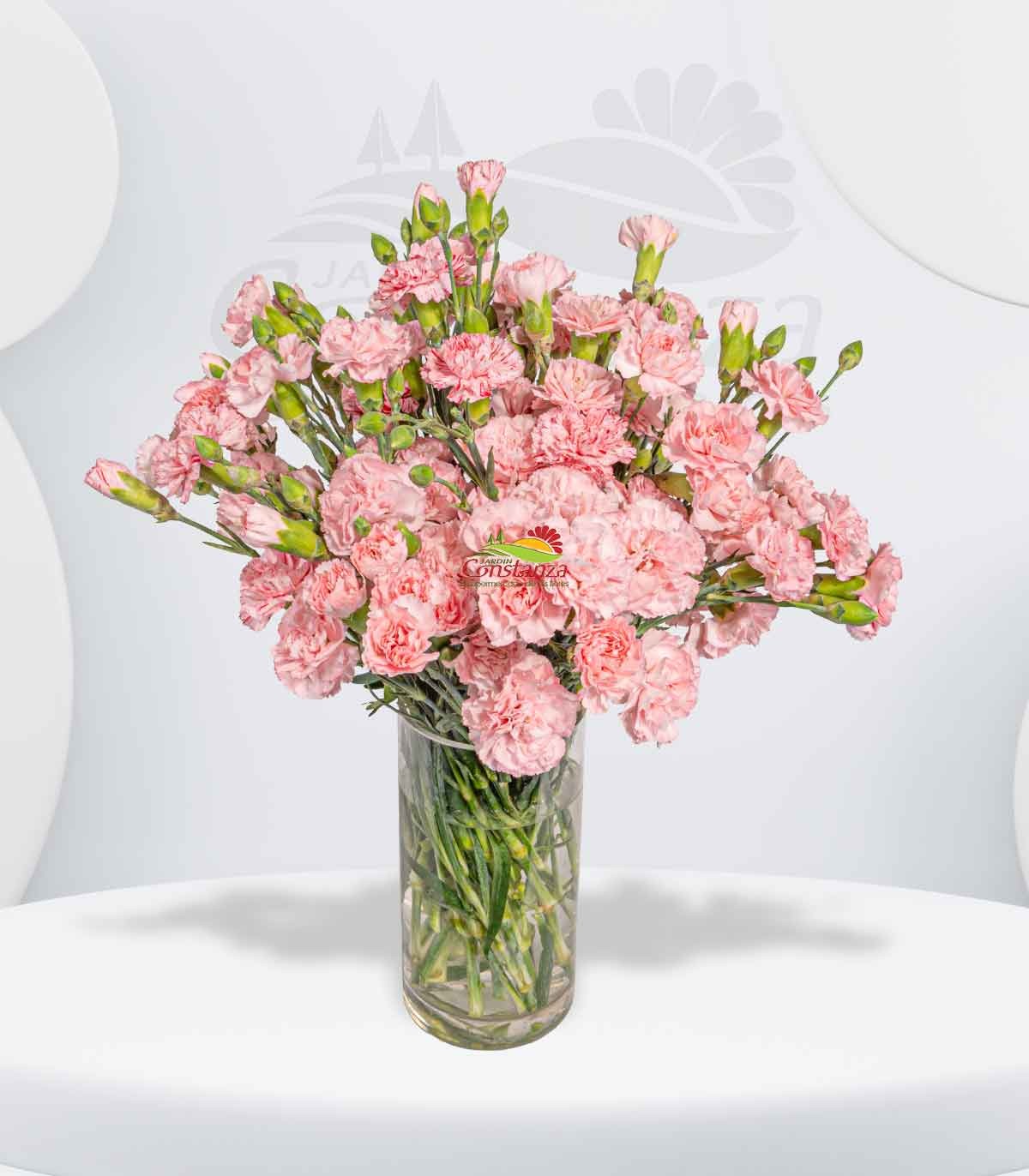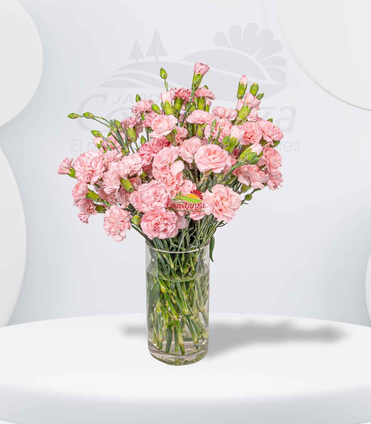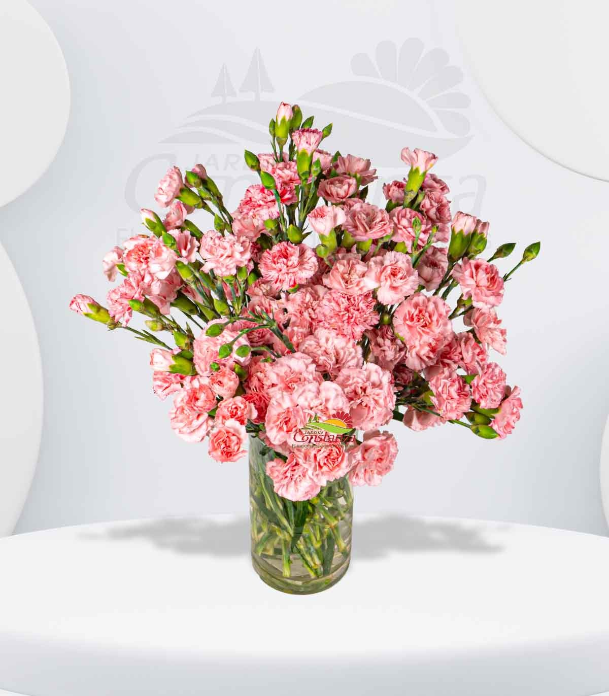 Este arreglo en base de cristal realza la belleza de los claveles, una flor cargada de significado y tradición. Con sus pétalos rizados y su variedad de colores, transmite amor, admiración y ternura. Ideal para regalar en cualquier ocasión o para dar un toque romántico y elegante a tu hogar.