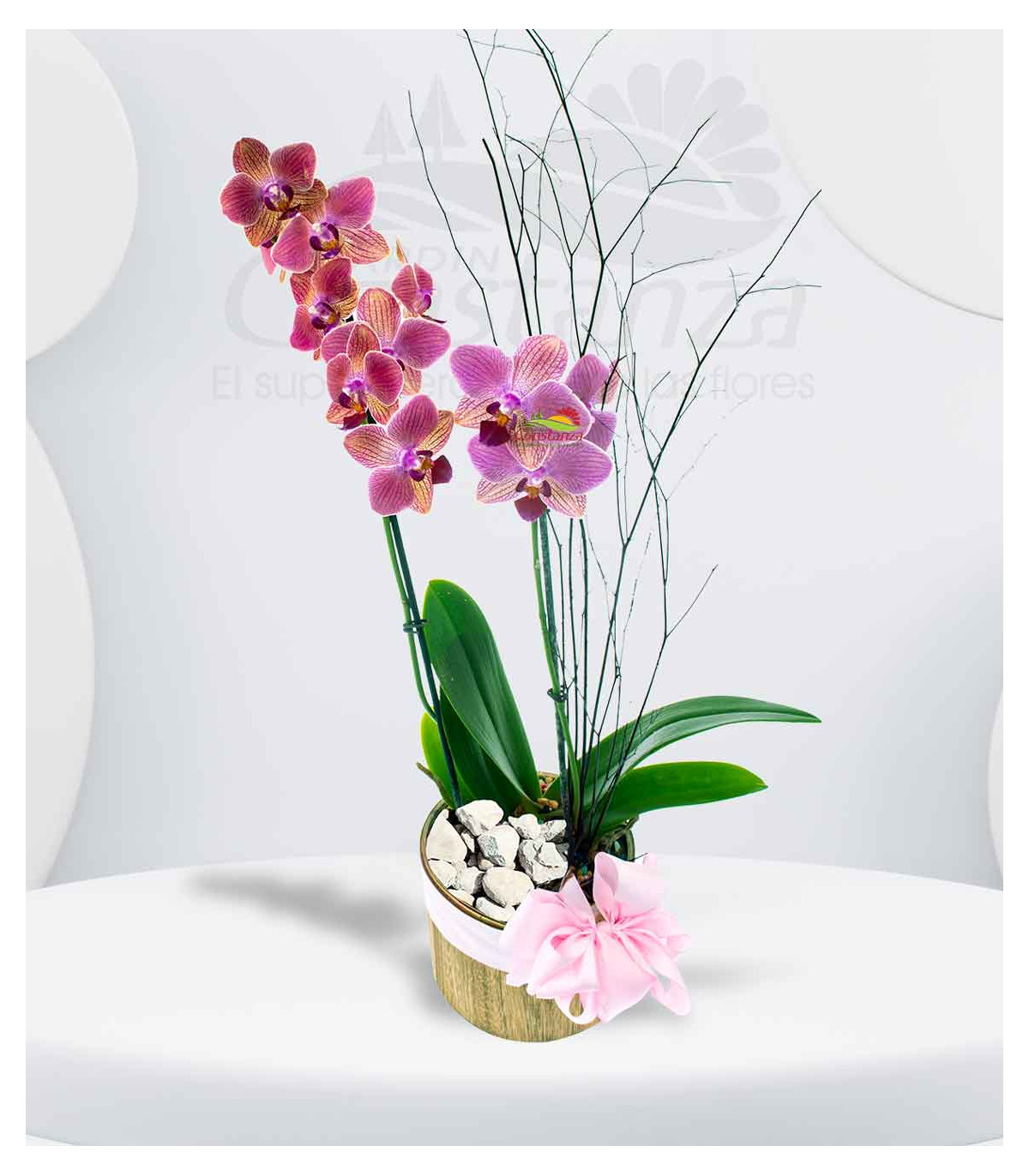Un encantador arreglo de planta de orquídea de dos espigas, presentado en una caja redonda de madera, decorada con piedras y delicados complementos que realzan su estilo natural. Perfecto para regalar, transmitir buenos deseos o dar un toque sofisticado y fresco a cualquier ambiente. 🌸🌳