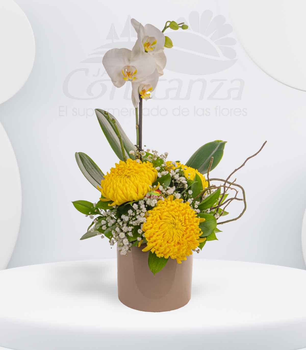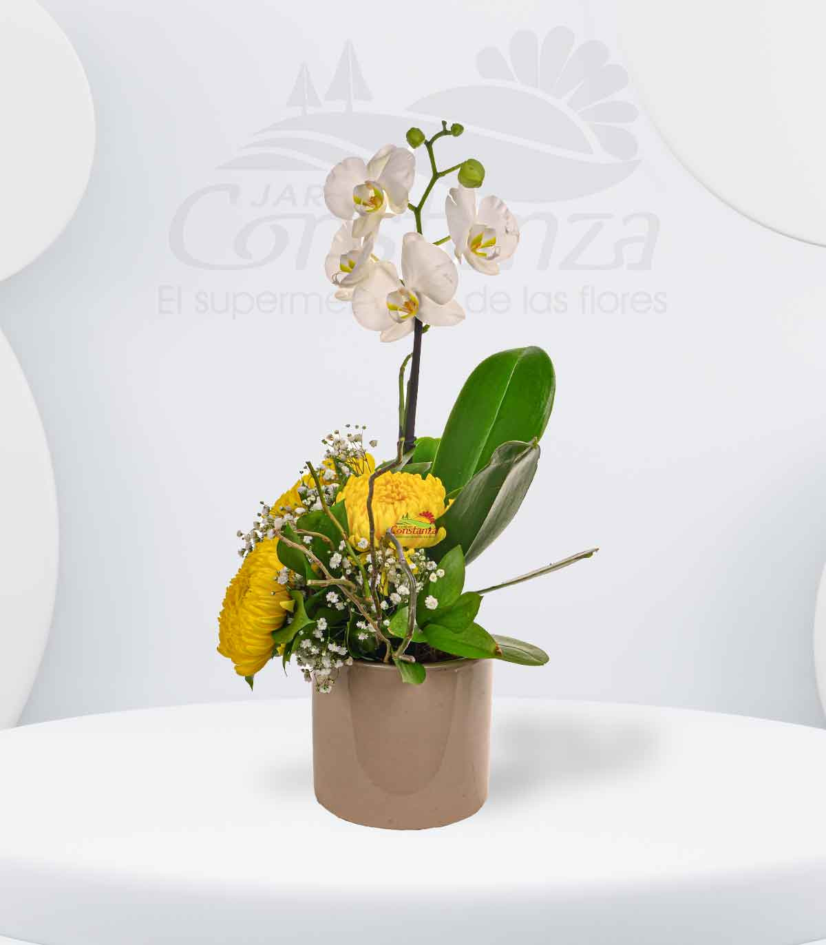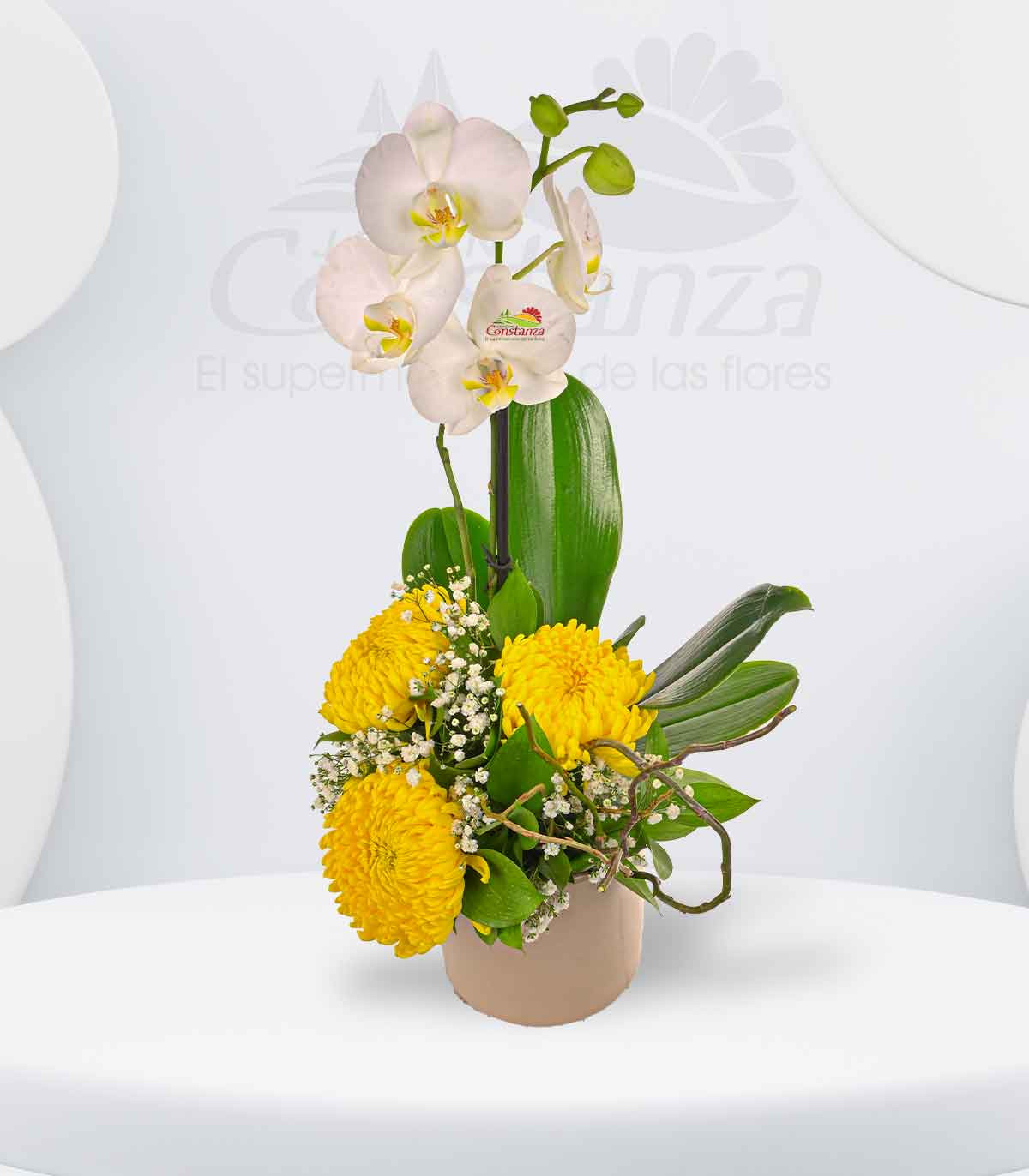 Una orquídea de una espiga combinada con tres crisantemos amarillos, presentada en una cerámica beige que aporta suavidad y equilibrio. Los complementos frescos realzan su belleza y crean un arreglo armonioso, moderno y lleno de luz. Perfecto para regalar o dar un toque especial a cualquier espacio